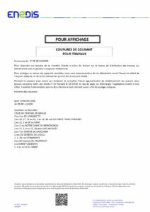 𝗘𝗡𝗘𝗗𝗜𝗦 NOUS INFORME DE COUPURES DE COURANT EN RAISON DE TRAVAUX DANS PLUSIEURS ZONES DU VILLAGE LUNDI 2 FEVRIER 2026 entre 9h et 12h aux adresses ci-dessous : RUE DES ANCIENS COMBATTANTS AFN AVENUE SANCHE DE GASCOGNE LUNDI 2 FEVRIER 2026 entre 14h00 et 17h00 aux adresses ci-dessous : RUE DES ANCIENS COMBATTANTS AFN AVENUE SANCHE DE GASCOGNE ROUTE DE LOURDES LUNDI 9 FEVRIER 2026 entre 9h et 12h aux adresses ci-dessous : IMPASSE LA PRADETTE Pour protéger au mieux vos appareils sensibles, nous vous recommandons de les débrancher avant l’heure de début de coupure indiquée, et de ne les rebrancher qu’une fois le courant rétabli. Nous vous remercions pour votre compréhension. Pour connaître l’heure approximative de rétablissement du courant, vous pouvez consulter le site enedis.fr en flashant le QR CODE en bas du document joint. Pour suivre l’évolution de cette coupure et connaître l’heure approximative de rétablissement du courant, vous pouvez consulter notre site enedis.fr/panne-et-interruption. Toutefois l’alimentation pourra être rétablie à tout moment avant la fin de la plage indiquée. Si vous restiez exceptionnellement sans courant après la période indiquée, notre service dépannage est à votre disposition au : 09 72 67 50 + les deux chiffres de votre département (appel non